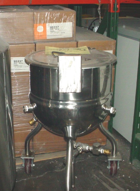 Used Groen model F20 kettle. Stainless steel construction. Jacket rated 25 psi @ 300 degrees F. Serial number 93148-1. NB 138270. 1991. Stainless steel legs on castors. No bottom outlet.